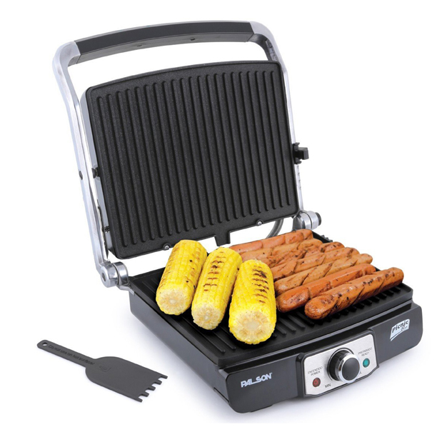 - Twin cooking plates open to 180 degrees.